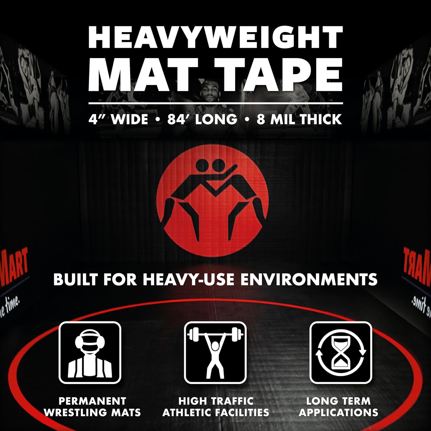 - Vinyl mat tape used for wrestling, grappling, MMA, and volleyball portable flooring.