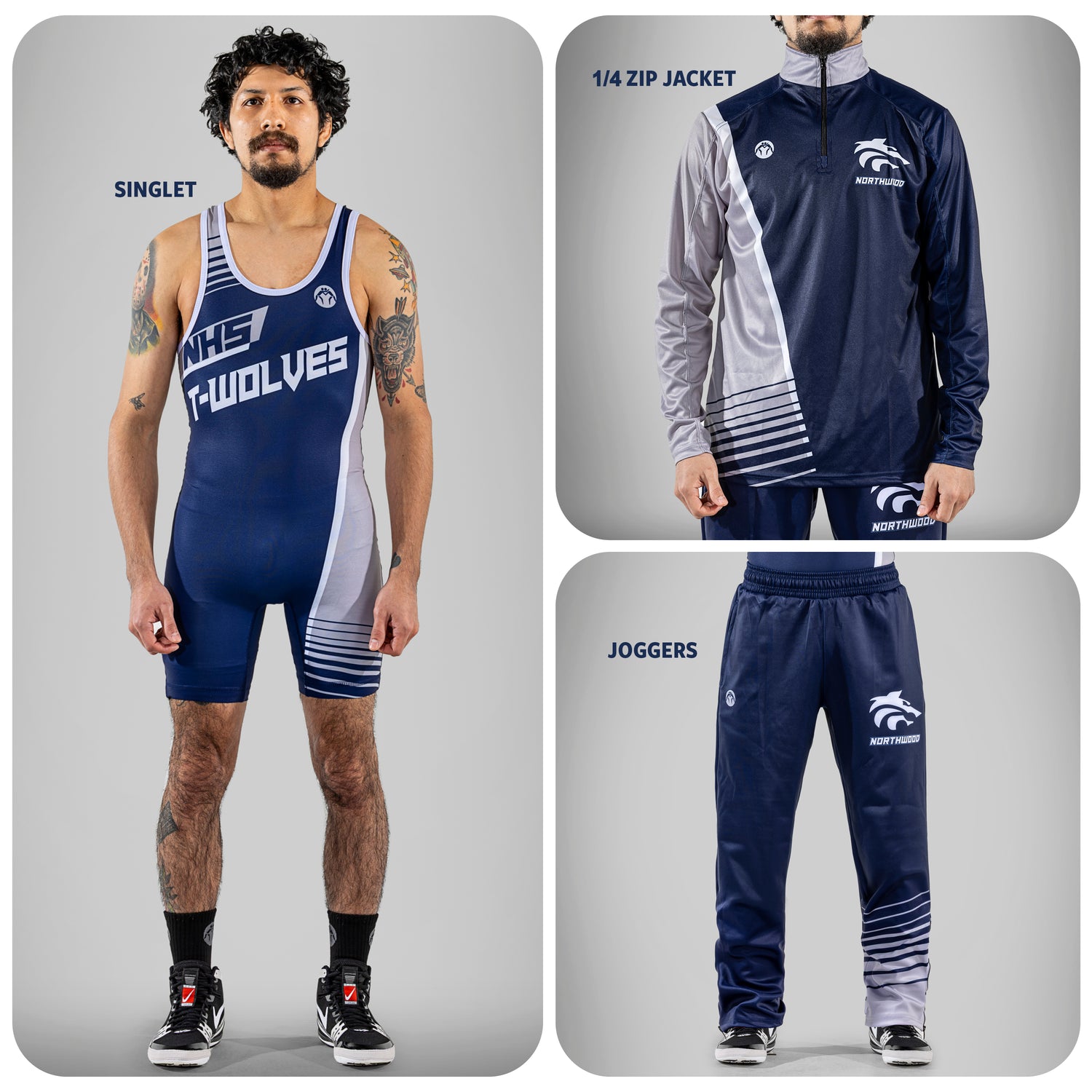 Includes: Fully sublimated 1/4 zip jacket, jogger, and singlet